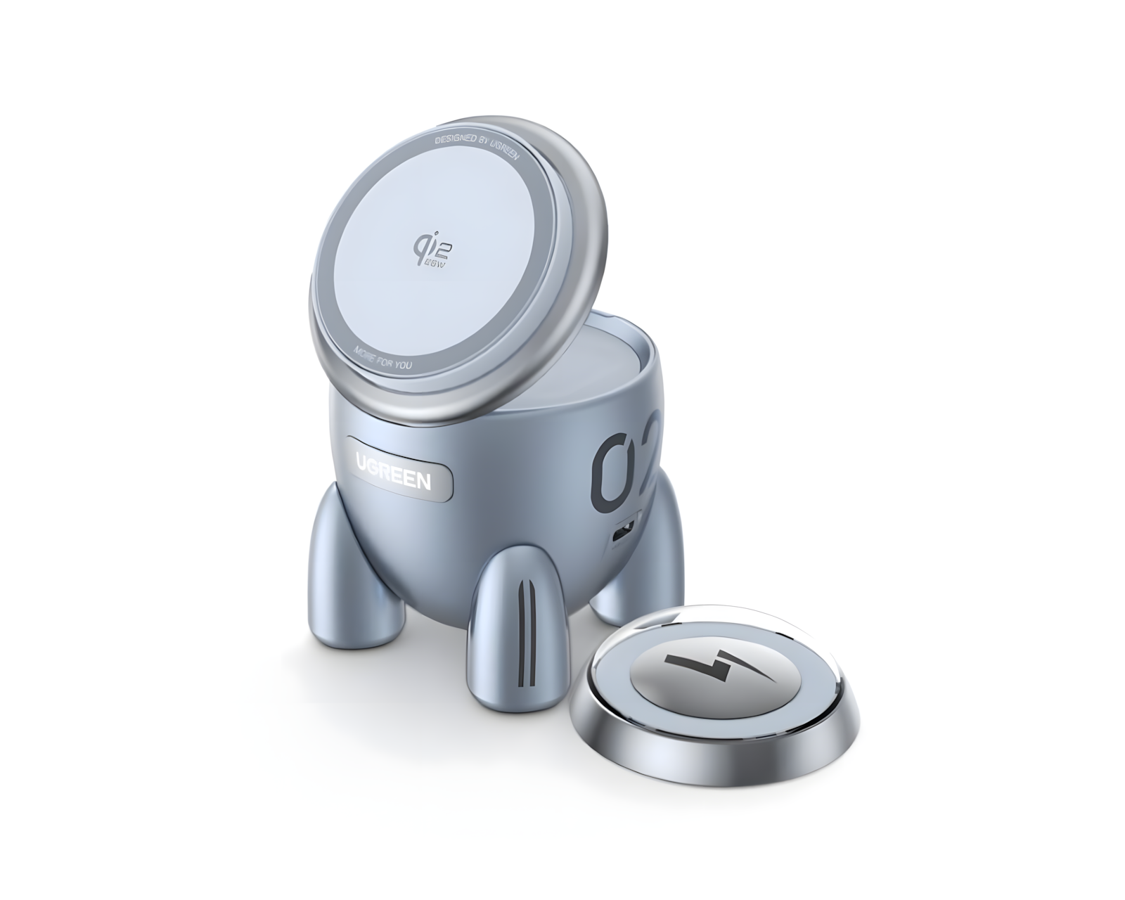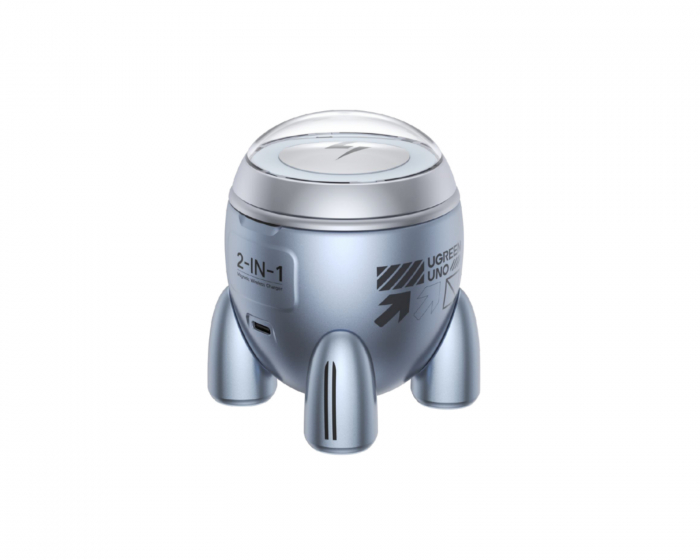 MagFlow Qi2.2 25W 2-in-1 Rocket Magnetic Wireless Charger is a wireless charging solution from UGREEN that offers certified Qi2 technology. This charger supports the MPP protocol and delivers up to 25W, enabling efficient magnetic wireless charging for iPhone 16 and newer models (15W max for iPhone 12 to 15). The design with 16 interconnected N48H magnets ensures a strong and precise magnetic connection, with a holding strength of up to 7N for reliable connection and charging.The unique rocket design creates a playful and decorative element while offering fast wireless charging via a magnetic surface with adjustable angle. The futuristic ice blue LED lights provide a clear indication of the charging status at a glance. With specifications such as a USB-C (IN) input of 9.0V-3.0A and a total wireless charging power of up to 30W, it is a practical solution for Apple product users. Included in the package are a 2-in-1 magnetic wireless charger, a 1m USB-C to USB-C charging cable, and a user manual.