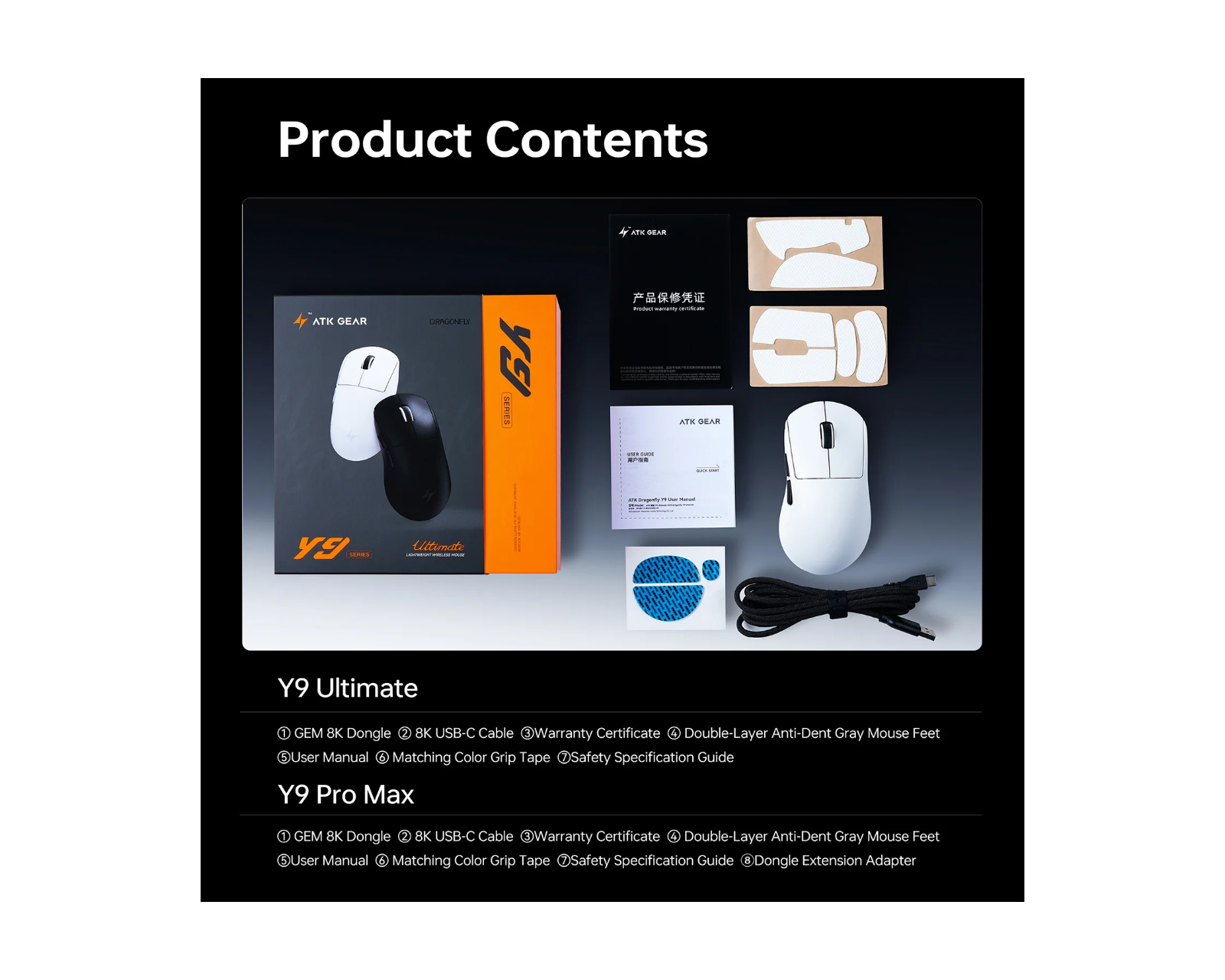 ATK Y9 Ultimate is a wireless gaming mouse from ATK that offers an ergonomic design for high comfort during extended use. The mouse has a weight of 55±2g and an adjustable polling rate between 125 and 8000Hz, which makes it highly responsive during gaming. It is equipped with a PAW3950 Ultra sensor for precise tracking, which is essential for gamers who demand accuracy.The mouse's construction includes a new nano-coating that not only improves grip but also extends durability. It has dimensions of 125.6mm x 67.5mm x 43.3mm, making it suitable for most hand sizes. The ATK Y9 is specifically designed for high-performance gaming where prolonged use and precise execution are crucial.