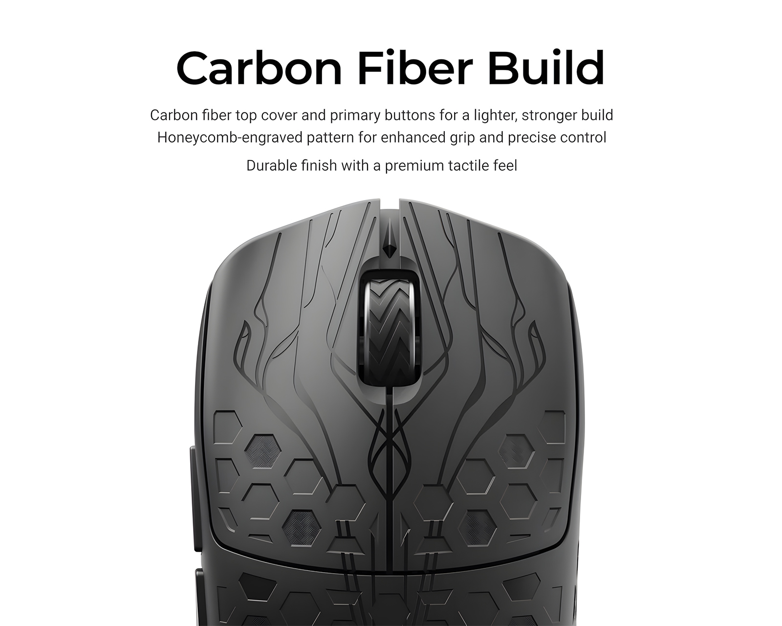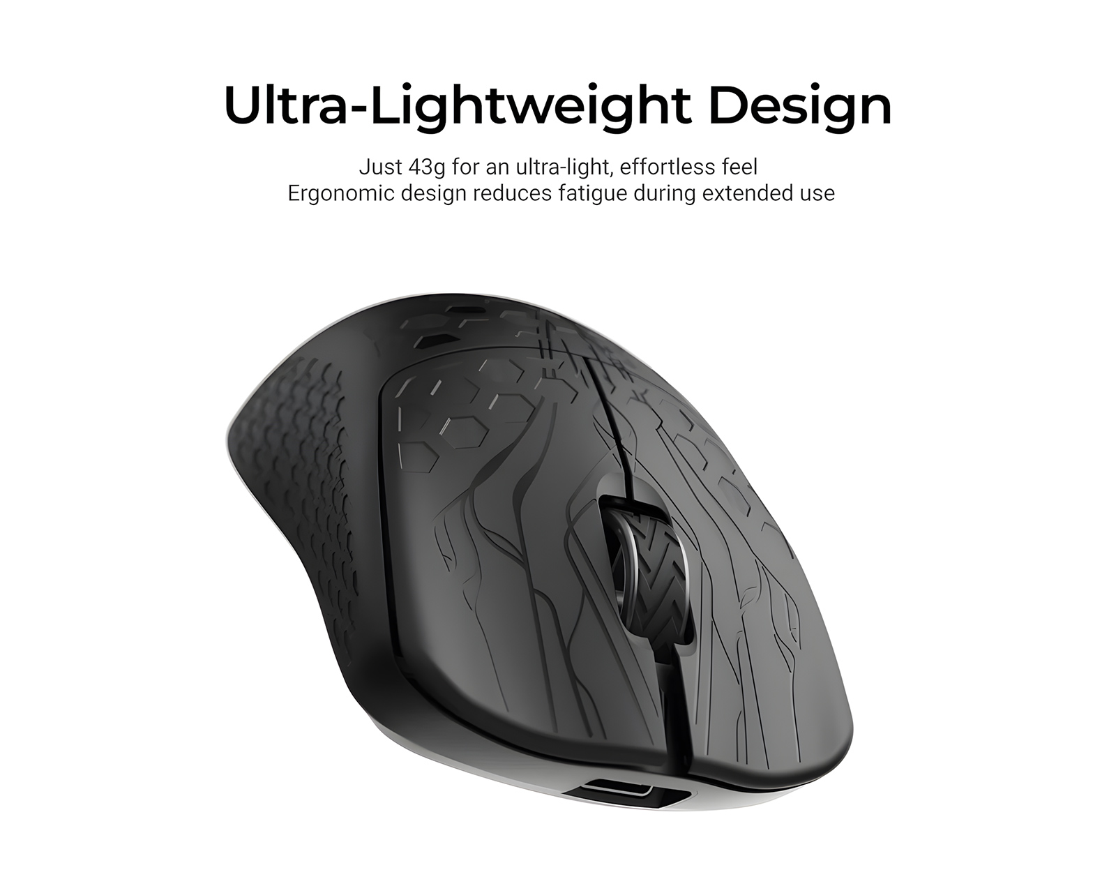 G5 8K Ultra Light Wireless Mouse is a mouse from Keychron that combines a lightweight design with superior performance. It is equipped with an advanced PixArt 3950 sensor and offers both 2.4 GHz and Bluetooth connections for flexible use. With an ergonomically designed shell, it provides comfort during long sessions.The product weighs only 43 grams thanks to its carbon fiber construction, ensuring a robust and durable experience without compromising on weight. The connection via 2.4 GHz provides low latency and quick response, which is crucial for both gaming and office work. It has a DPI of up to 20,000, enabling high precision and fast movements. G5 offers up to eight different polling rates, including 8000 Hz, resulting in a response time of only 0.41 ms in 2.4 GHz mode.