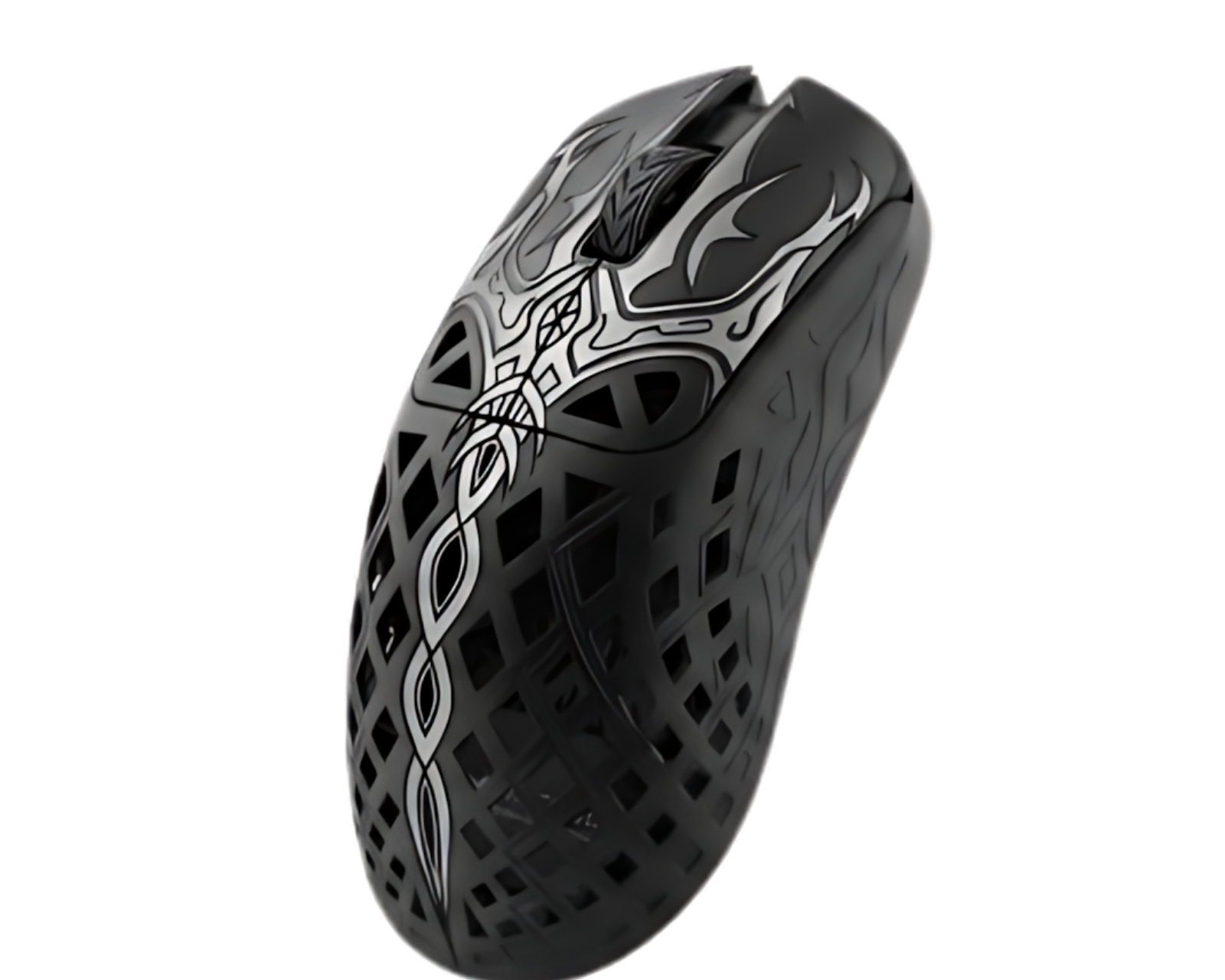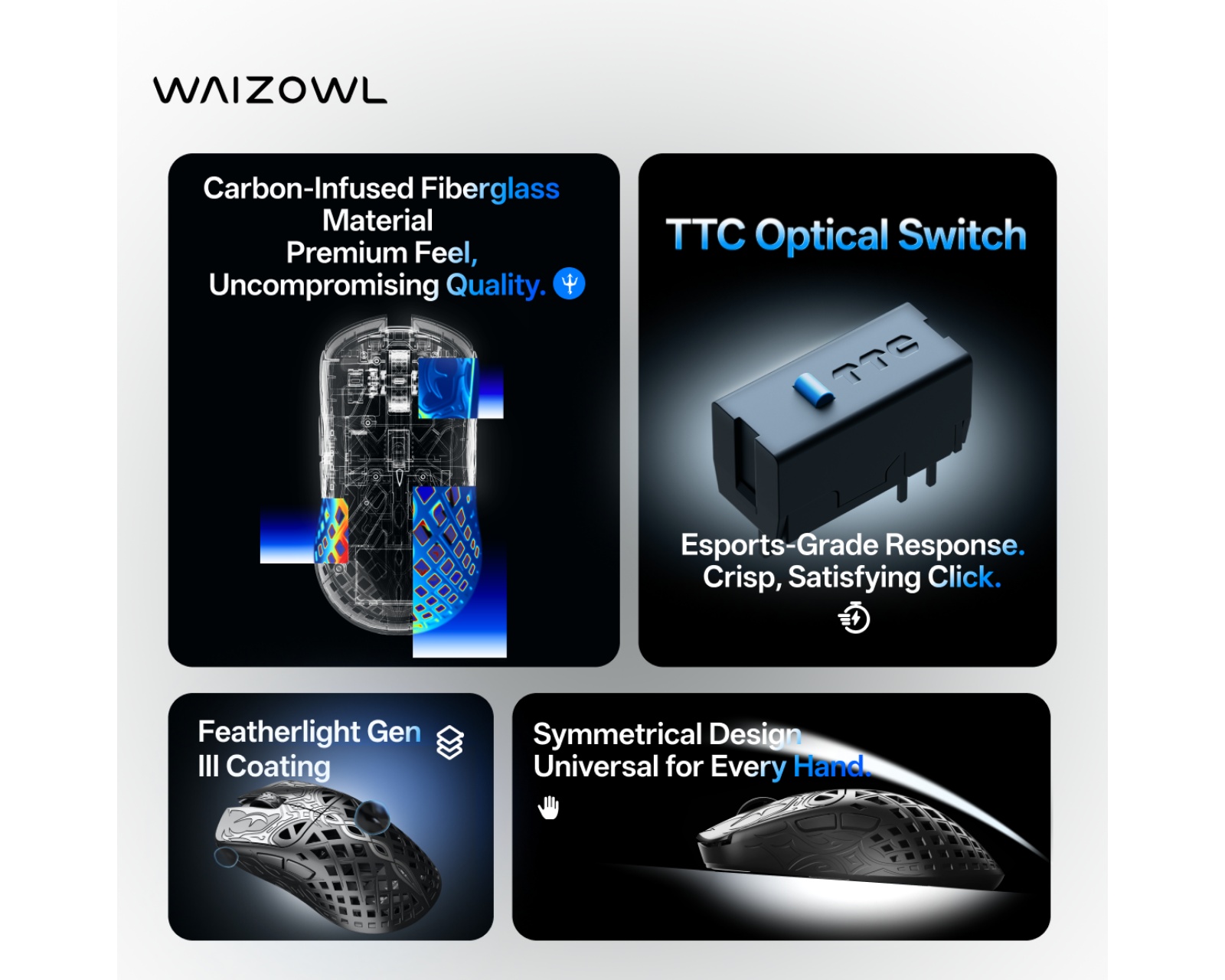 TRIAINA is a wireless gaming mouse from Waizowl that combines extreme lightweight with top-performing technology. Weighing only 49 grams and featuring one of the world's fastest charging solutions with a 4C battery, it elevates the gaming experience to a new level by offering a full charge in just 22 minutes.The mouse's construction in fiberglass and polycarbonate contributes to a rigid and durable design without compromising on weight. The custom 3950 HAWKEYE sensor enables pixel-perfect tracking and stability, giving players precise control during intense gameplay moments. The ergonomic low-profile design is optimized for various grip styles, maximizing comfort during extended gaming sessions. TRIAINA also offers impressive battery life, lasting up to 170 hours at a 1K polling rate, supporting long gaming without interruptions.