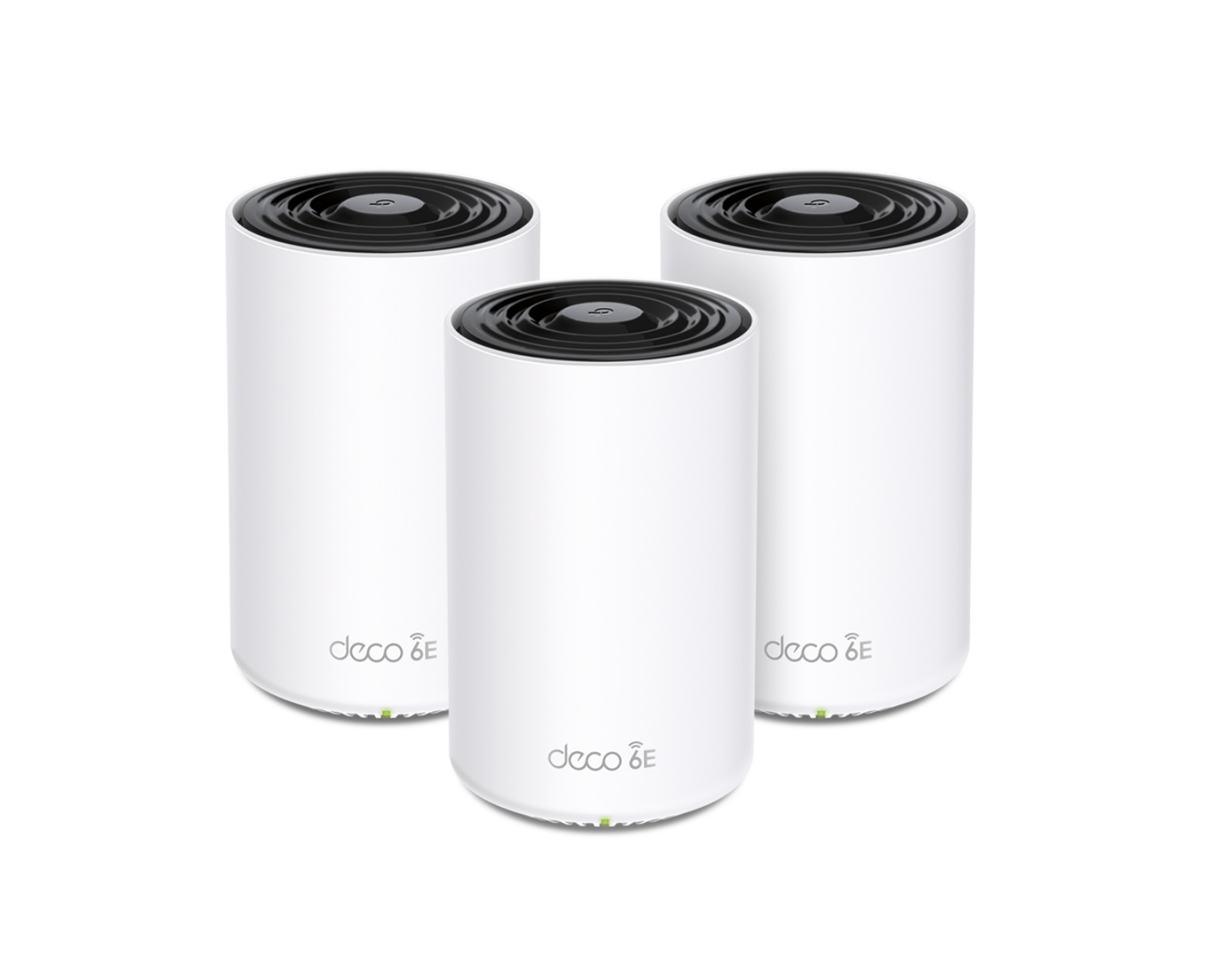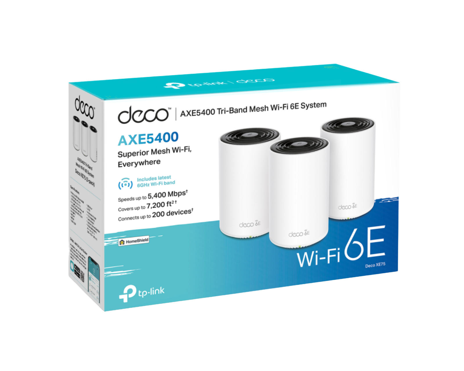 Deco XE75 Tri-Band WiFi 6E Mesh System (3-pack) is a wireless router from TP-Link that offers next-generation seamless WiFi solutions for your home. It can cover up to 650 square meters and handle speeds of up to 5,400 Mbps by combining all three WiFi bands, making buffering and dead zones a thing of the past. The sibling Deco units connect easily and efficiently, enhancing the network experience throughout the home.Built to provide a stable connection, the Deco XE75 combines advanced AI technology to optimize network performance. It is backward compatible with all previous WiFi versions, ensuring that all your devices work flawlessly, regardless of provider or modem. With TP-Link HomeShield, you also get robust protection for your home network and IoT devices. Installation is simplified through the Deco app, which guides the user step by step for a smooth experience. The wireless networking solution is specifically designed for gamers and tech enthusiasts who demand higher performance and security.