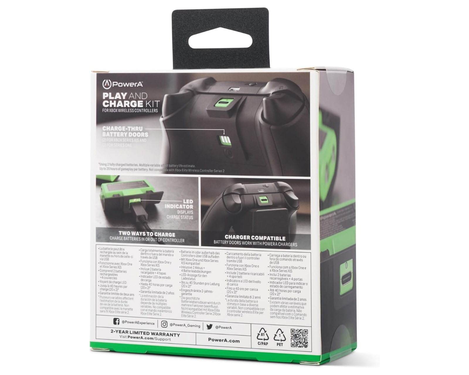 Play & Charge Kit for Xbox Series X|S is a power solution from PowerA that combines charging and gameplay in one package. The kit includes two rechargeable batteries and four battery covers, providing flexibility for gamers who want to avoid constantly replacing batteries. An LED battery indicator provides information about the charging status, making it easier to manage energy levels.The kit is compatible with Xbox Series X|S and Xbox One wireless controllers. The material used is plastic and the entire kit weighs 167.83 grams, making it easy to handle and transport. With a power output of 10 watts and an input voltage of 240 volts, it is designed to efficiently charge the batteries during gameplay or standby mode. The USB Type A connection allows for an easy connection to the device for charging.
